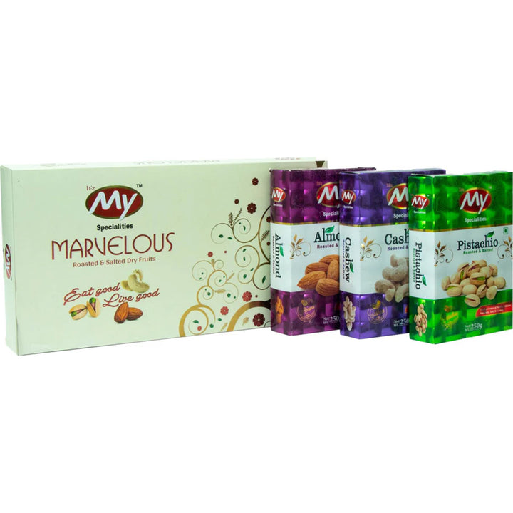 MARVELOUS Roasted & Salted Dry Fruits | Festive Dry Fruits Gift Pack | Contains Almonds, Cashews, Pistachios (3 x 250 g)